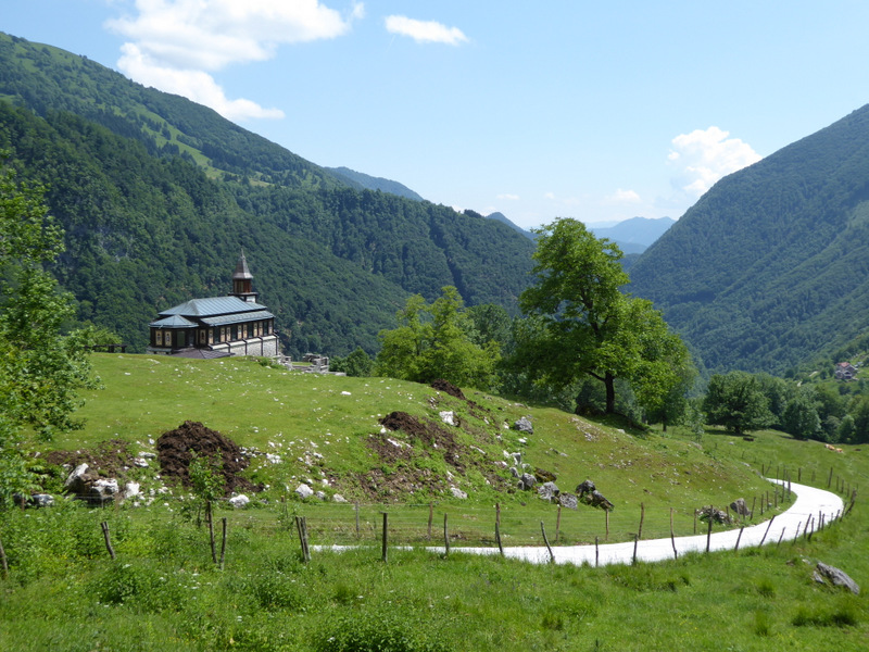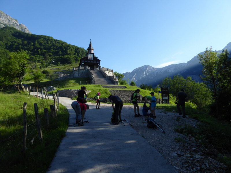 Za vzpon smo si izbrali nekoliko manj obiskano pot, ki bi bila zanimiva tudi gorskim kolesarjem. Markirano pot kot »Pot miru« smo pričeli na parkirišču na planini Srednjica oz. pod Javorco, obšli znamenito cerkev, posvečeno sv. Duhu, oz. bolj znano kot spominsko cerkev z napisanimi več kot 2800 imeni vojakov različnih narodnosti, padlih na soški fronti. Cerkev je bila zgrajena še med vojno leta 1916. Ta unikaten spomenik je letos zaradi mednarodnega pomena prejel znak evropske kulturne dediščine (ZED), kar pomeni, da je poleg bolnice Franje edini tovrstni spomenik pri nas od manj kot 40 spomenikov v Evropi s tem priznanjem.