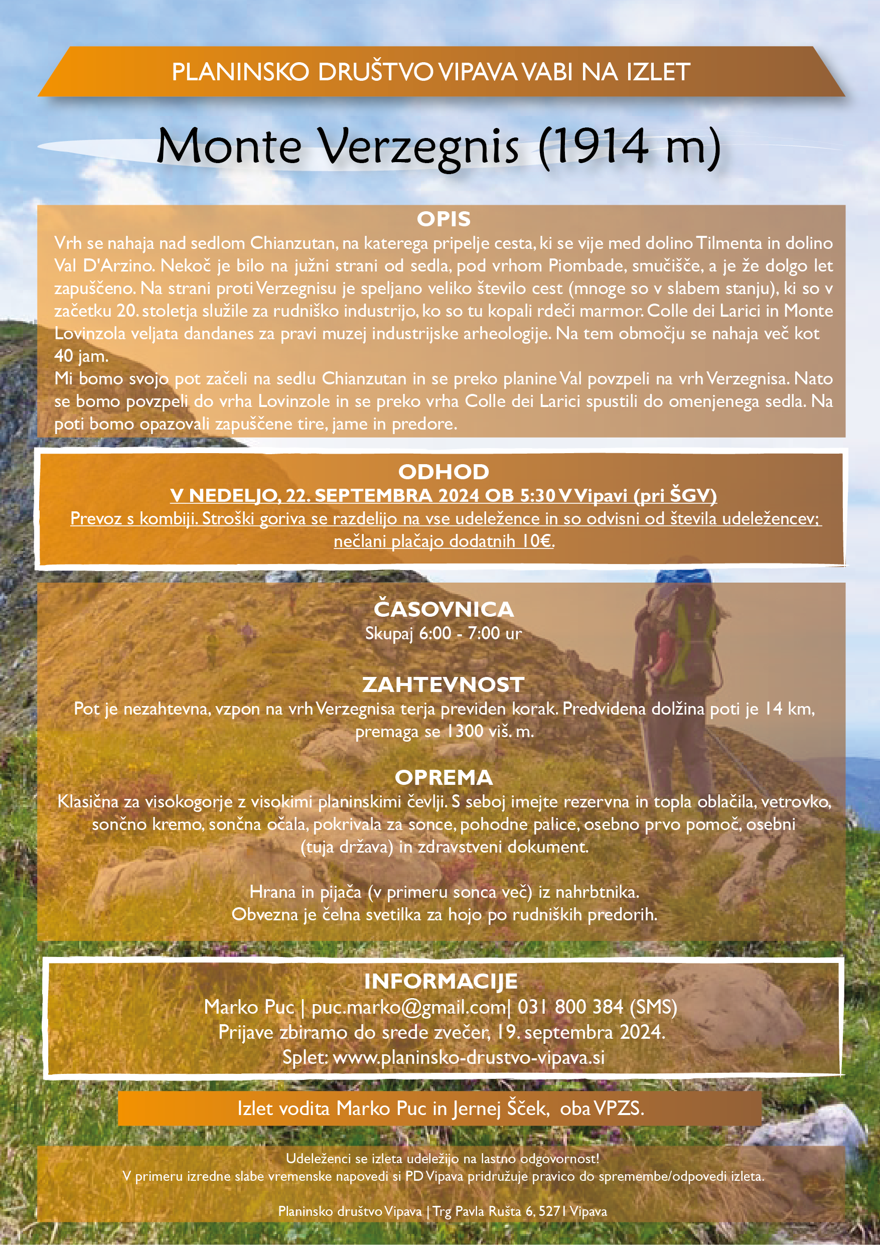 V primeru izredne slabe vremenske napovedi si PD Vipava pridružuje pravico do spremembe/odpovedi izleta.