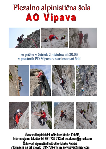 Alpinistični Odsek Vipava organizira Plezalno – alpinistično šolo. Prvo predavanje bo v četrtek 2. oktobra ob 20.00 v prostorih PD Vipava.
